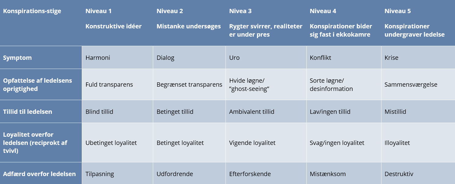- Kritiske stadier (konspirationsteorier tager overhånd): Tilliden til ledelsen er stærkt svækket, og organisationen risikerer at miste kontrol. Bestyrelsen bør i disse tilfælde vurdere ledelsens håndtering og om nødvendigt implementere strukturelle forandringer for at genetablere tillid.